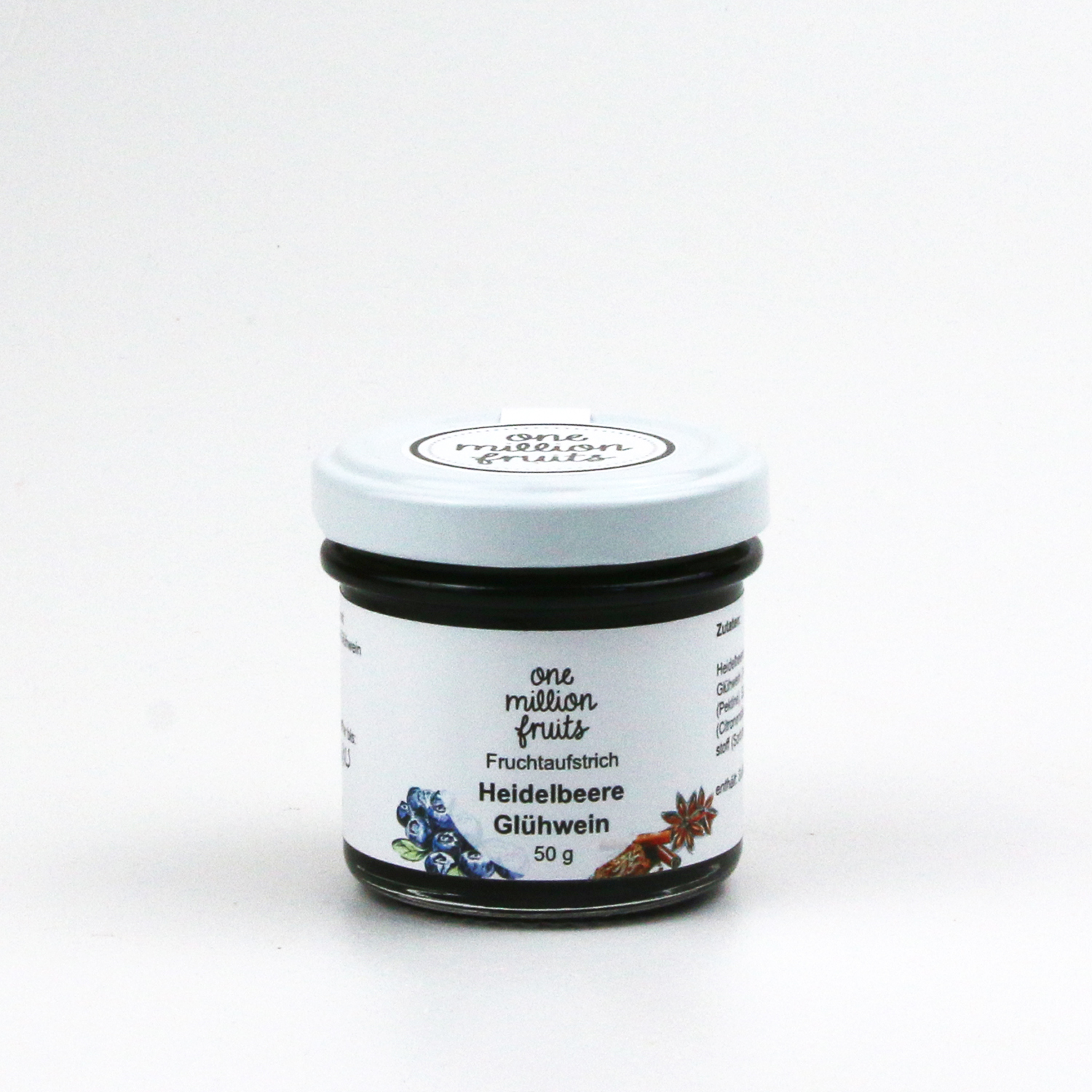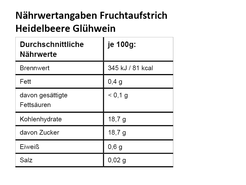 Heidelbeeren (50%), Zucker, Glühwein (14%), Geliermittel (Pektine), Säuerungsmittel (Citronensäure), Konservierungsstoff (Sorbinsäure)