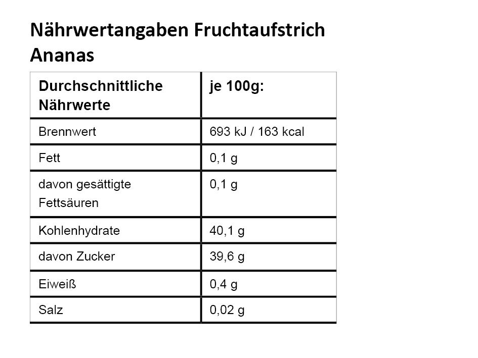 Ananas (67%), Zucker, Geliermittel (Pektine), Säuerungsmittel (Citronensäure), Konservierungsstoff (Kaliumsorbat)