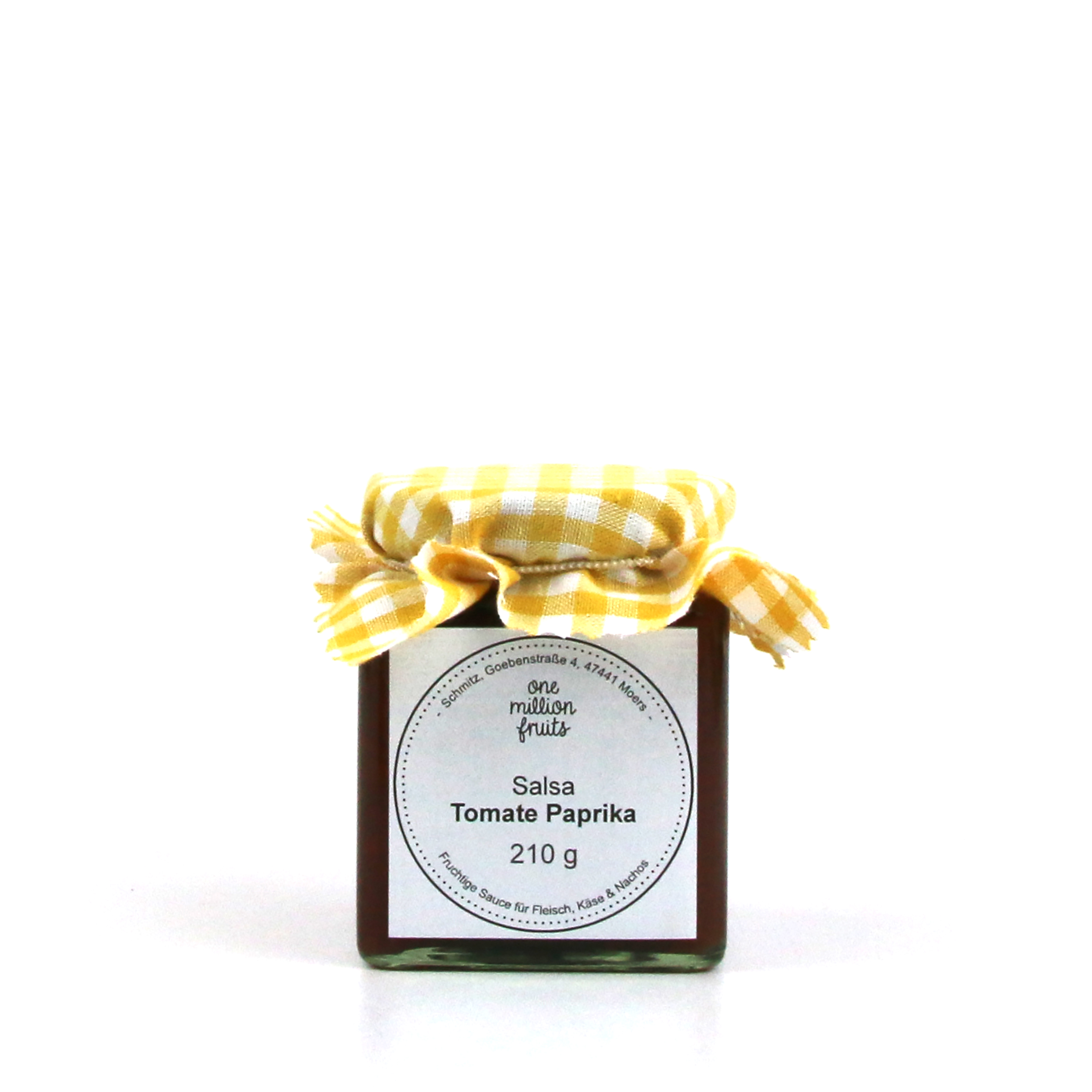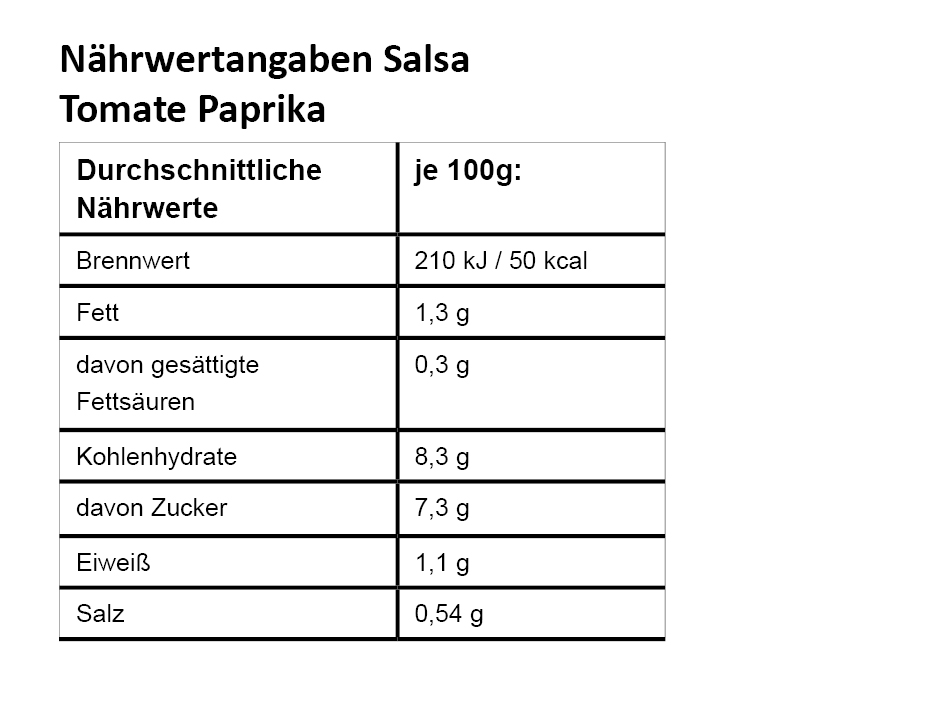 Tomaten (39,2%), gelbe Paprika (31%), Zucker, Zwiebeln, Apfelessig, Chili, Olivenöl, Luisenhaller Tiefensalz, Pfeffer, Geliermittel (Pektine), Säuerungsmittel (Citronensäure), Konservierungsstoff (Kaliumsorbat)