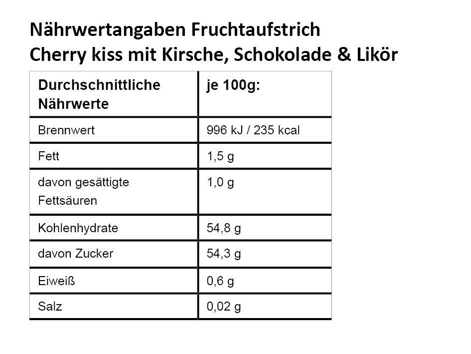 Dieser Fruchtaufstrich vereint Fruchtige Kirschen mit zart schmelzender Schokolade und wird durch hausgemachten Kirschlikör abgerundet.